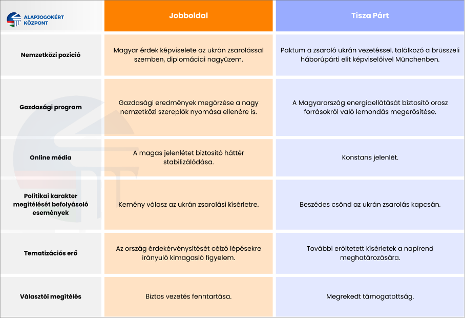 Februárban jogi értelemben is megkezdődött az országgyűlési választási kampány, a versengő pártok aktivistái már az utcákat járják, vagyis teljes gőzzel folyik a korteskedés. Az Alapjogokért Központ hónapról hónapra megvizsgálja, hogy melyik politikai szereplőnek kedvezhetett elsősorban a mögöttünk hagyott időszak napirendjének alakulása. Tavaly nyár eleje óta azt tapasztaljuk, hogy a közbeszéd arcélét adó témák azt a képet erősítik, amely szerint a jelenlegi bizonytalan és veszélyes időszakban a jobboldal képes érvényesíteni Magyarország érdekeit, míg a Tisza Párt erőteljes függő viszonyban áll olyan külső szereplőkkel – Brüsszellel és Kijevvel –, amelyek a magyar emberek javát figyelmen kívül hagyva kívánják érvényesíteni akaratukat. Ennek a benyomásnak a kontúrjait csak még élesebbre húzták a februári történések.