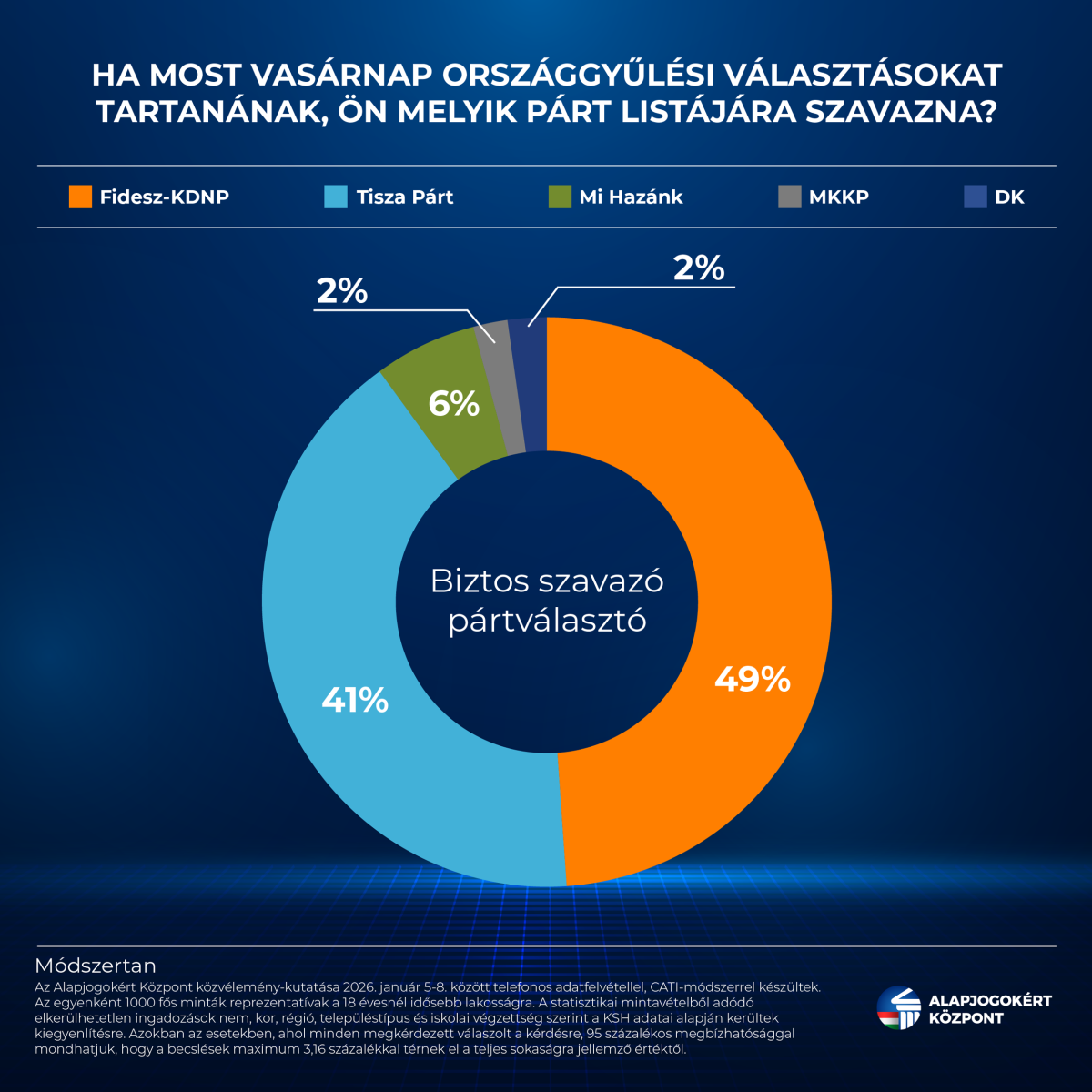 A Fidesz-KDNP országos listáját a biztos szavazó pártválasztók 49 százaléka támogatná egy most vasárnap esedékes választáson, míg a Tisza Pártra csak 41 százalékuk voksolna – derül ki az Alapjogokért Központ friss, országosan reprezentatív közvélemény-kutatásából. A pártpreferencia adatok az utóbbi egy hónapban érdemben nem változtak, a kormánypártok előnye állandósult: 8 százalékpontos, jóval hibahatáron túli különbség birtokában vágnak neki a választásoknak. A jobboldal elmúlt hónapokban mért népszerűség-növekedése és stabilizálódása mögött az húzódhat meg, hogy április 12-éhez közeledve egyre többen érzik úgy, hogy a „biztos választás” valóban biztosabb, mint a veszélyes alternatíva.
