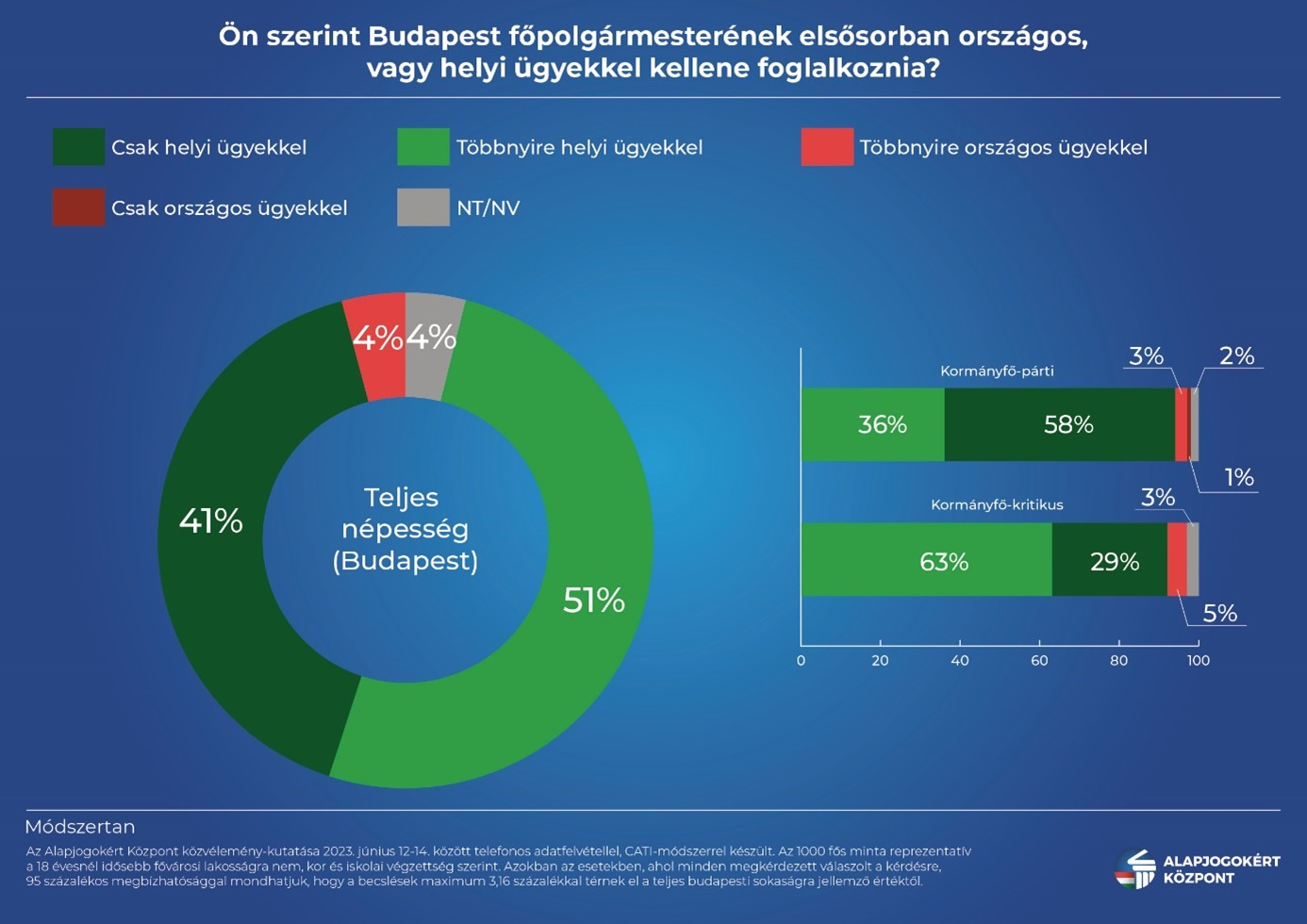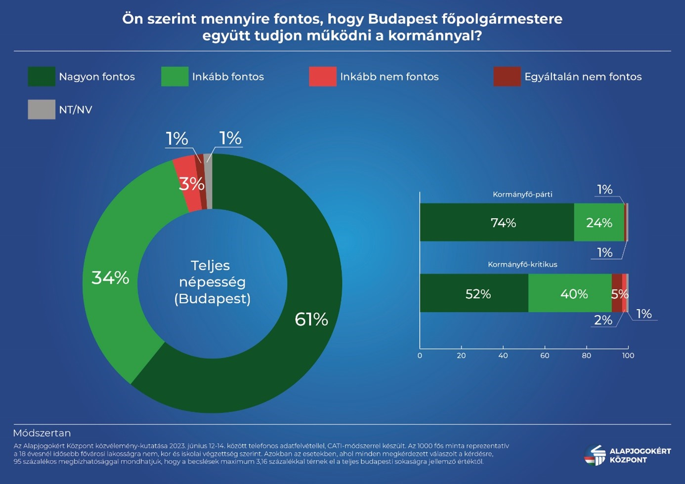 Módszertan: Az Alapjogokért Központ közvélemény-kutatása 2023. június 12-14. között telefonos adatfelvétellel, CATI-módszerrel készült. Az 1000 fős minta reprezentatív a 18 évesnél idősebb fővárosi lakosságra nem, kor és iskolai végzettség szerint. Azokban az esetekben, ahol minden megkérdezett válaszolt a kérdésre, 95 százalékos megbízhatósággal mondhatjuk, hogy a becslések maximum 3,16 százalékkal térnek el a teljes budapesti sokaságra jellemző értéktől.